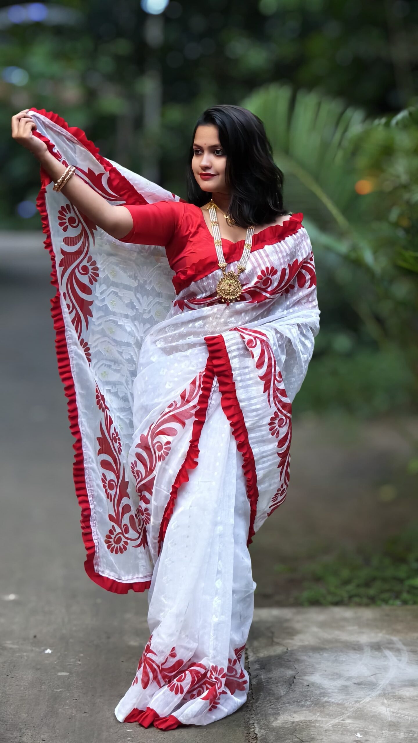 Exclusive Trending White Red Dhakai Jamdani Saree Without B.P.